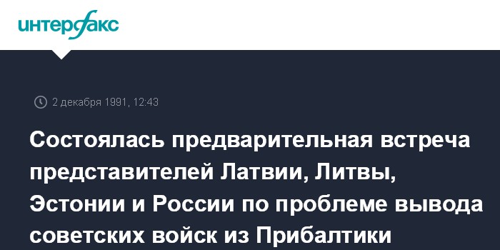 Таллинн. 2 декабря. ИНТЕРФАКС. Депутат парламента Эстонии Юри Лийм (Juri Liim) сообщил "Балтфаксу" (совместное предприятие "Интерфакса" и агентства БНС), что 29 ноября в резиденции правительства в Лохусалу под Таллинном состоялась предварительная встреча представителей Эстонии, Латвии, Литвы и России. На ней обсуждалась проблема вывода советских войск из Балтийских стран.