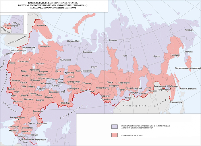 Следствием стал парад суверенитетов автономий внутри союзных республик. Если бы план автономизации был реализован до конца, то Россия потеряла бы 51% территории со всеми стратегическими ресурсами и почти 20 млн. населения (см. рис. 1).