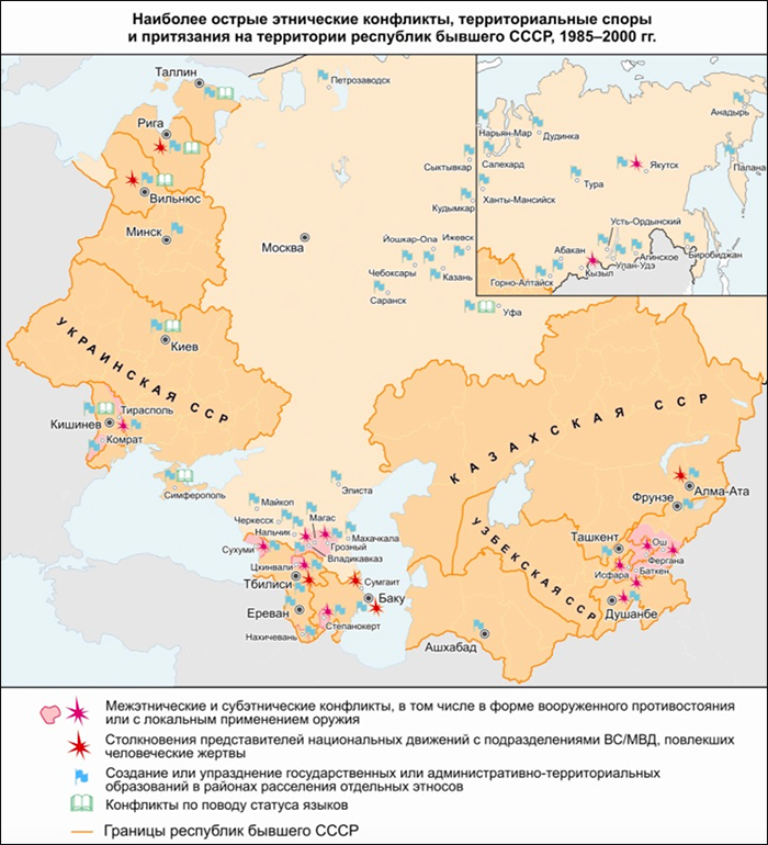 В-четвертых, это резкий рост межнациональных конфликтов и территориальных споров с вооруженными действиями и кровопролитием. Трагические ошибки национальной политики – с репрессиями и выселениями целых народов – вели к тому, что распад СССР мог пойти по кровавому "югославскому сценарию".