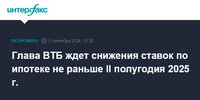 "На горизонте до середины следующего года мы не ожидаем такого существенного сокращения ставки Центрального банка. Во втором полугодии, возможно, ставка пойдет вниз, мы надеемся. И тогда, конечно, ипотечные ставки вслед за учетной ставкой тоже пойдут вниз", - сказал глава ВТБ в интервью телеканалу "Россия 24" в рамках Восточного экономического форума (ВЭФ-2024).