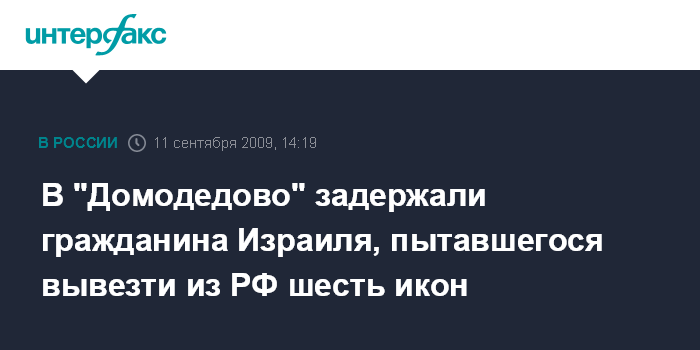 Москва. 11 сентября. INTERFAX.RU - Таможенники задержали в московском аэропорту "Домодедово" гражданина Израиля, пытавшегося вывезти из России партию уникальных икон конца XIX-начала XX века, сообщает пресс-служба Федеральной таможенной службы (ФТС).