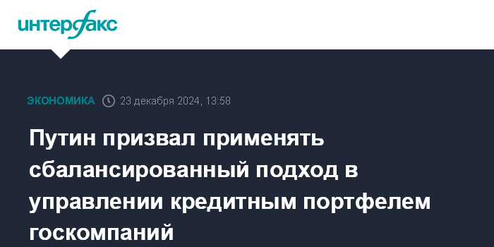 Москва. 23 декабря. INTERFAX.RU - Власти должны применять сбалансированный подход в управлении кредитным портфелем компаний с госучастием, сохранив для них возможность развития, заявил президент РФ Владимир Путин на совещании по экономическим вопросам.