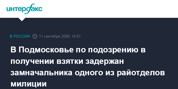 Москва. 11 сентября. INTERFAX.RU - В Подмосковье по подозрению в получении взятки задержан один заместителей начальника ОВД Воскресенского района, сообщил в пятницу "Интерфаксу" источник в правоохранительных органах. Как рассказал собеседник агентства, по предварительным данным, в управление собственной безопасности МВД Московской области обратился предприниматель, который заявил, что один из заместителей начальника ОВД Воскресенского района вымогает у него деньги якобы за покровительство его бизнеса. В ходе спецоперации при получении 14 тыс. рублей сотрудники УСБ задержали заместителя начальника ОВД Воскресенский. Возбуждено уголовное дело. Задержанный находится в следственном отделе следственного комитета при прокуратуре Воскресенского района.