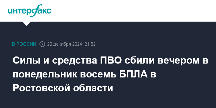 Силы и средства ПВО сбили вечером в понедельник восемь БПЛА в Ростовской области