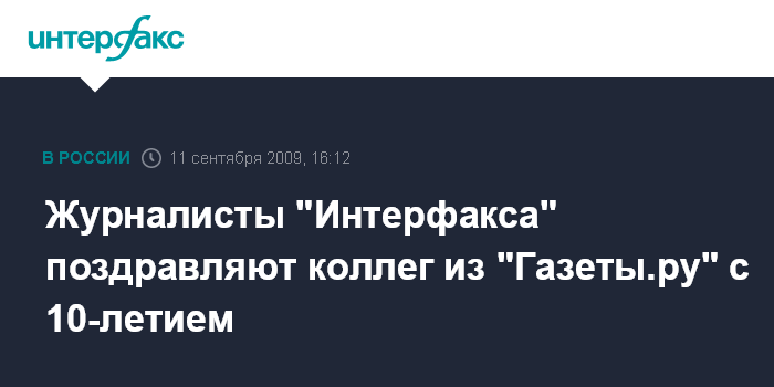 Москва. 11 сентября. INTERFAX.RU - Поздравляем коллектив "Газеты.ру" с десятилетием. За эти годы "Газета.ру" стала единственным в своем роде сетевым ресурсом, которому присущи все признаки настоящей газеты за исключением традиционной печатной версии. "Газета" собрала уникальную аудиторию – от студентов до топ-менеджеров, чиновников, представителей власти.