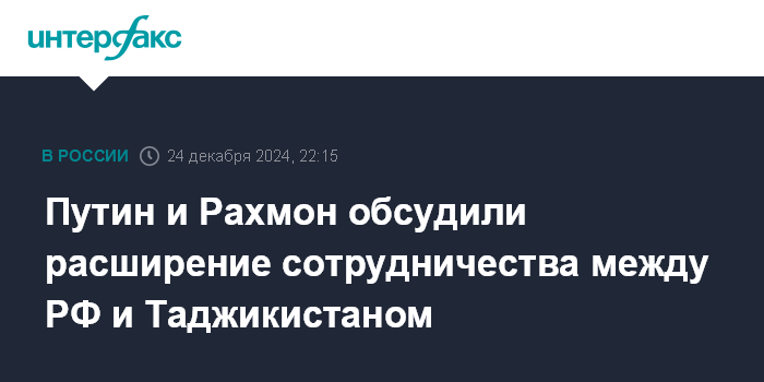 Москва. 24 декабря. INTERFAX.RU - В ходе рабочей встречи в Санкт-Петербурге президентов Таджикистана и России Эмомали Рахмона и Владимира Путина обсуждались нынешнее состояние и перспективы таджикско-российских отношений, сообщила пресс-служба таджикского лидера.