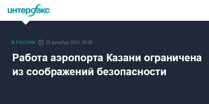 Москва. 25 декабря. INTERFAX.RU - В работе аэропорта Казани с утра введены временные ограничения для обеспечения безопасности полетов гражданских воздушных судов, сообщает телеграм-канал представителя Росавиации Артема Кореняко.