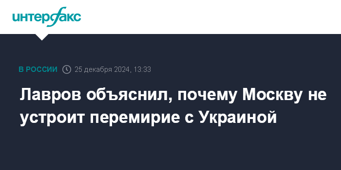Москва. 25 декабря. INTERFAX.RU - Москву не устроит перемирие с Украиной, ей нужны юридически обязывающие гарантии, заявил программе "60 минут" на телеканале "Россия 1" глава российского МИД Сергей Лавров.