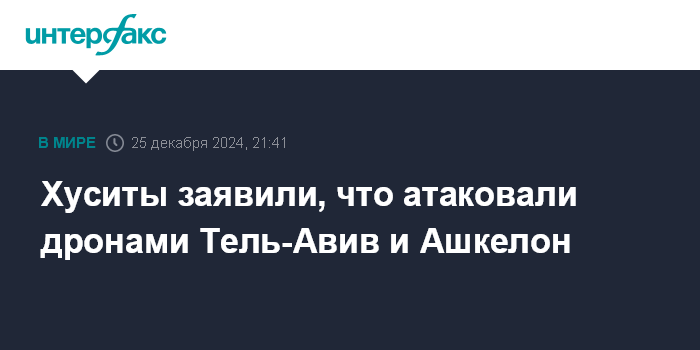 Москва. 25 декабря. INTERFAX.RU - Йеменские мятежники-хуситы в среду сообщили о нанесении ударов беспилотниками по городам Тель-Авив, который хуситы называют Яффой, и Ашкелон в Израиле.