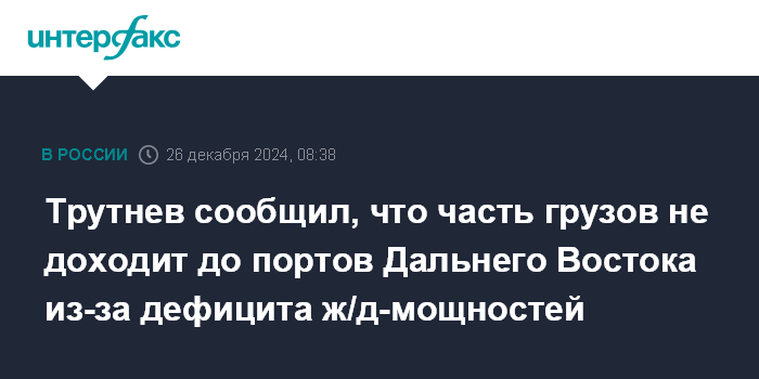 Москва. 26 декабря. INTERFAX.RU - Морские порты Дальнего Востока справляются со значительно возросшей нагрузкой, но часть грузов не доходит до них из-за дефицита провозных мощностей железной дороги, сообщил вице-премьер - полномочный представитель президента РФ в ДФО Юрий Трутнев в интервью каналу "Россия 24" (ВГТРК).