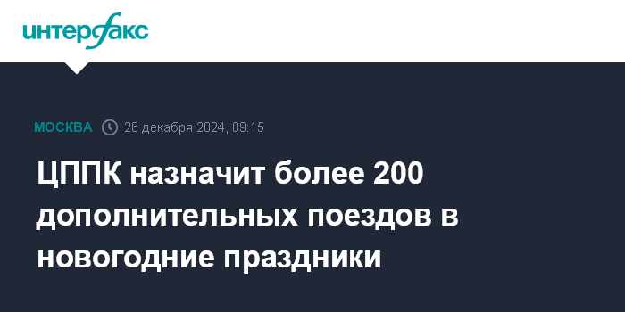 Москва. 26 декабря. INTERFAX.RU - Центральная пригородная пассажирская компания (ЦППК) совместно с Московской железной дорогой (МЖД) внесли корректировки в расписание в предпраздничные и праздничные дни, сообщили "Интерфаксу" в пресс-службе ЦППК.