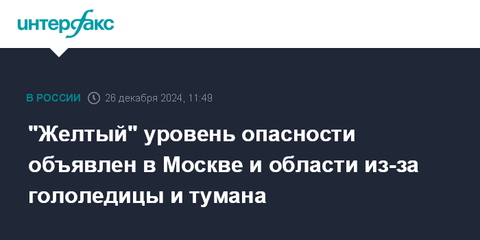 Москва. 26 декабря. INTERFAX.RU - В Москве и Московской области объявили "желтый" уровень погодной опасности из-за гололедицы на дорогах и тумана, следует из данных Гидрометцентра России.