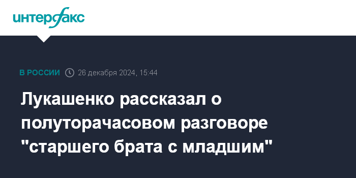 Москва. 26 декабря. INTERFAX.RU - Президент Белоруссии Александр Лукашенко рассказал на полях саммита в Петербурге Лукашенко рассказал, что днем ранее обсудил с президентом России Владимиром Путиным широкий круг вопросов. Фрагмент его заявления опубликовал аккаунт программы "Время Первого" телеканала "Беларусь 1".