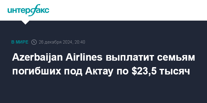 Москва. 26 декабря. INTERFAX.RU - Наблюдательный совет авиакомпании Azerbaijan Airlines определил сумму компенсаций для пострадавших и семьям погибших в результате крушения самолета Embraer 190 в Казахстане.