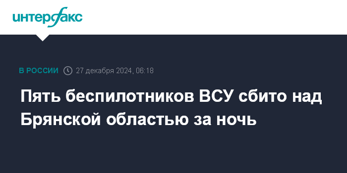 Москва. 27 декабря. INTERFAX.RU - Губернатор Брянской области Александр Богомаз сообщил об уничтожен пяти украинских беспилотников самолетного типа над регионом в ночь на пятницу.