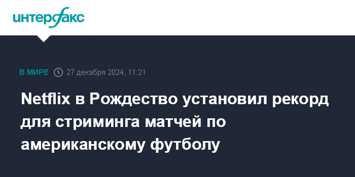 Москва. 27 декабря. INTERFAX.RU - Более 24 млн пользователей в среднем посмотрели два матча по американскому футболу, которые транслировались в стриминговом сервисе Netflix Inc. в рождественские праздники, сообщила компания со ссылкой на данные Nielsen.