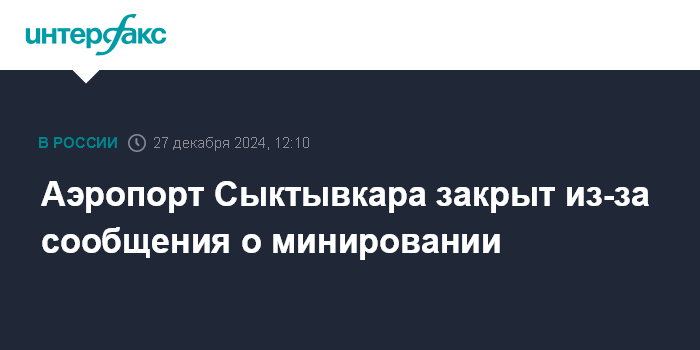 Москва. 27 декабря. INTERFAX.RU - Аэропорт Сыктывкара закрыт из-за поступившего сообщения о минировании, сообщает пресс-служба Министерства экономического развития, промышленности и транспорта Коми.