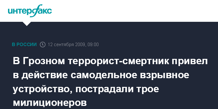 Ростов-на-Дону. 12 сентября. ИНТЕРФАКС-ЮГ - Трое милиционеров пострадали в результате взрыва, который произвел террорист-смертник в Грозном (Чеченская республика).