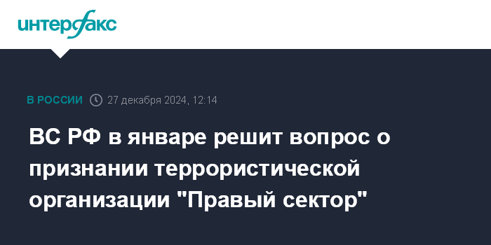 Москва. 27 декабря. INTERFAX.RU - Генпрокуратура просит Верховный суд России признать террористической организацию "Правый сектор", уже признанную в РФ экстремистской.