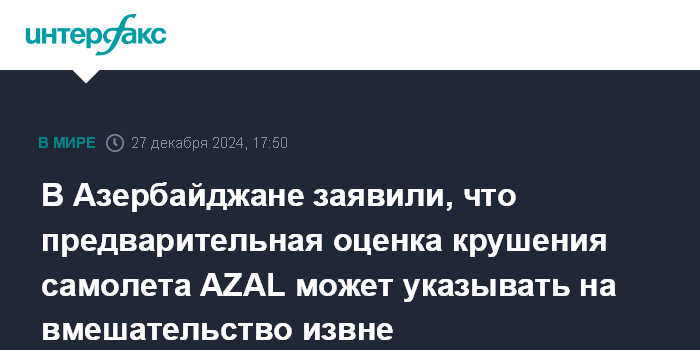 В Азербайджане заявили, что предварительная оценка крушения самолета AZAL может указывать на вмешательство извне