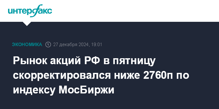 Рынок акций РФ в пятницу скорректировался ниже 2760п по индексу МосБиржи