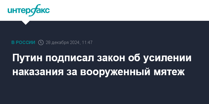 Москва. 28 декабря. INTERFAX.RU - Президент РФ Владимир Путин подписал закон об ужесточении ответственности вплоть до пожизненного лишения свободы за организацию вооруженного мятежа в РФ и участие в нем, сообщает официальный портал правовой информации.