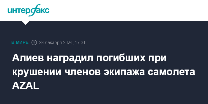 Москва. 29 декабря. INTERFAX.RU - Президент Азербайджана Ильхам Алиев подписал распоряжение о присвоении звания Национального героя трем членам экипажа самолета AZAL, выполнявшего рейс Баку-Грозный и потерпевшего 25 декабря крушение вблизи Актау.