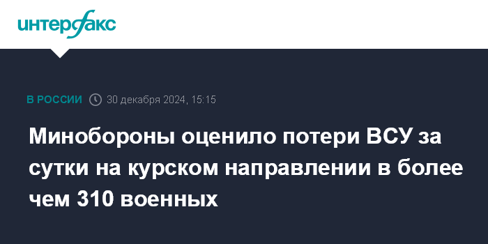 Москва. 30 декабря. INTERFAX.RU - Потери армии Украины на курском направлении за сутки составили свыше 310 человек, заявили в Минобороны РФ в понедельник.