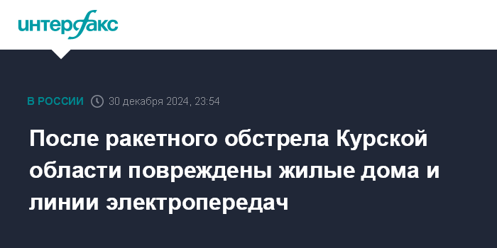 Москва. 30 декабря. INTERFAX.RU - В результате ракетной атаки на Курскую область в Льгове повреждены линии электропередачи, жилой дом, а также ранен мирный житель, сообщил губернатор региона Александр Хинштейн.