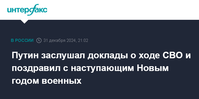 Москва. 31 декабря. INTERFAX.RU - Президент РФ Владимир Путин заслушал доклады о ходе СВО и поздравил всех военных с наступающим Новым годом, сообщил во вторник пресс-секретарь главы государства Дмитрий Песков.