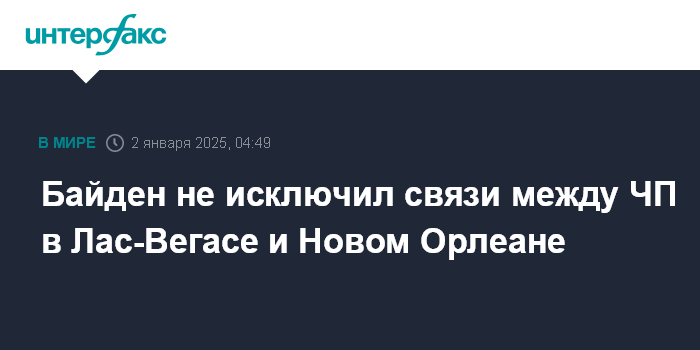Москва. 2 января. INTERFAX.RU - Президент США Джо Байден заявил о возможной связи между наездом пикапа на людей в Новом Орлеане и взрывом автомобиля Tesla Cybertruck возле отеля избранного президента Дональда Трампа в Лас-Вегасе.