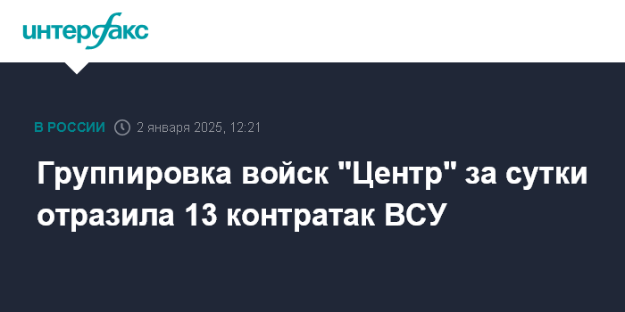 Москва. 2 января. INTERFAX.RU - Группировка войск "Центр" в течение суток улучшила положение и отразила 13 контратак вооруженных сил Украины, заявили в Минобороны РФ в четверг.