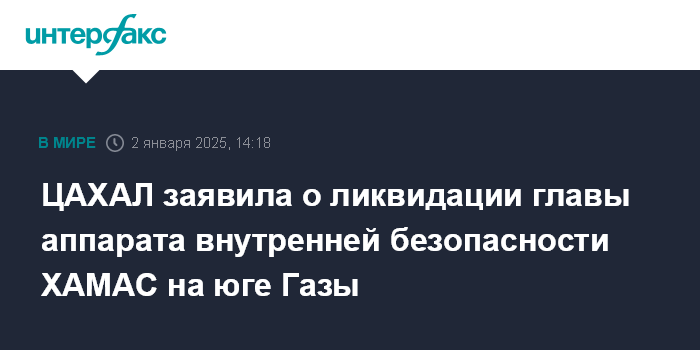 Москва. 2 января. INTERFAX.RU - Израильские военные уничтожили в Хан-Юнисе руководителя аппарата внутренней безопасности группировки ХАМАС на юге Газы Хусама Шахвана, говорится в сообщении Армии обороны Израиля (ЦАХАЛ) в телеграм-канале.