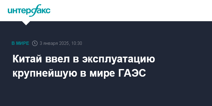 Москва. 3 января. INTERFAX.RU - Гидроаккумулирующая электростанция (ГАЭС) "Фэннин" была введена в полномасштабную эксплуатацию в конце прошлого года в городе Чэндэ провинции Хэбэй, расположенной на севере Китая, сообщает агентство "Синьхуа".