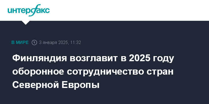 Москва. 3 января. INTERFAX.RU - Финляндия с 1 января возглавила оборонное сотрудничество стран Северной Европы (NORDEFCO), ее председательство продлится до конца 2025 года, сообщило в пятницу министерство обороны страны.