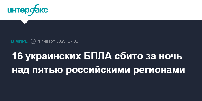 Москва. 4 января. INTERFAX.RU - В ночь на субботу российские военные уничтожили 16 украинских беспилотников над Брянской, Смоленской, Белгородской, Псковской и Ленинградской областями, сообщило Минобороны РФ.