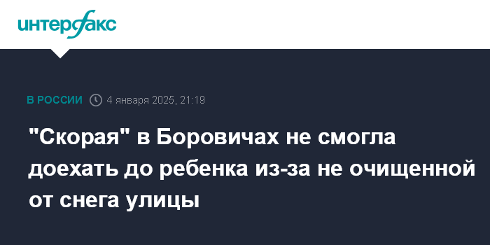 Москва. 4 января. INTERFAX.RU - Автомобиль скорой медпомощи в новгородском городе Боровичи не смог доехать до ребенка-эпилептика по вызову из-за того, что местные коммунальщики не очистили улицу от снежных завалов, сообщила в субботу пресс-служба региональной прокуратуры.