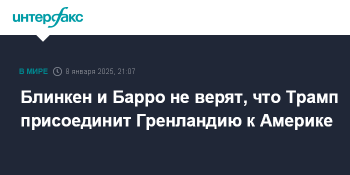 Москва. 8 января. INTERFAX.RU - Госсекретарь США Энтони Блинкен и глава МИД Франции Жан-Ноэль Барро выразили сомнения в том, что избранный президент США Дональд Трамп действительно сделает Гренландию частью США.