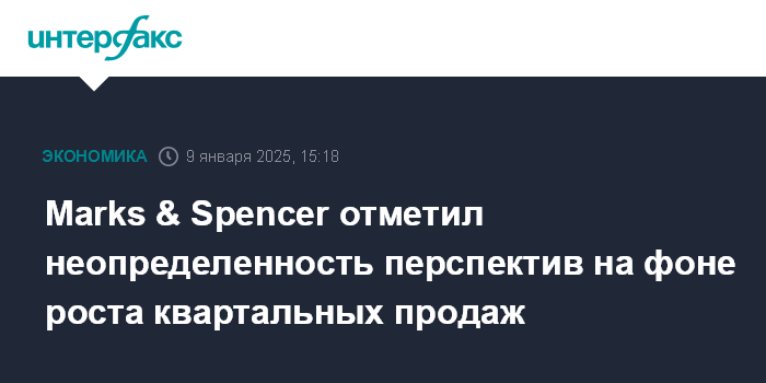 Москва. 9 января. INTERFAX.RU - Британская сеть универмагов Marks & Spencer Group Plc увеличила продажи в третьем финансовом квартале, но отметила неопределенность перспектив экономического роста, динамики инфляции и процентных ставок, а также рост издержек на фоне повышения налогов.