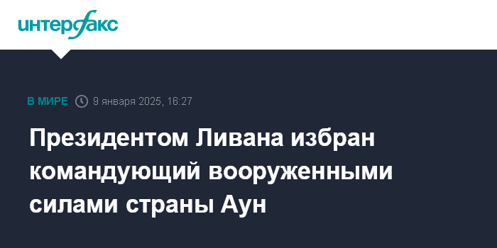 Москва. 9 января. INTERFAX.RU - Парламент Ливана избрал президентом страны президента Жозефа Ауна, который до сих пор был командующим вооруженными силами страны, сообщают ближневосточные СМИ.