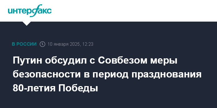 Москва. 10 января. INTERFAX.RU - Президент РФ Владимир Путин обсудил с постоянными членами Совбеза РФ дополнительные меры по обеспечению общественной безопасности в период подготовки и проведения празднования 80-й годовщины Победы в Великой Отечественной войне.