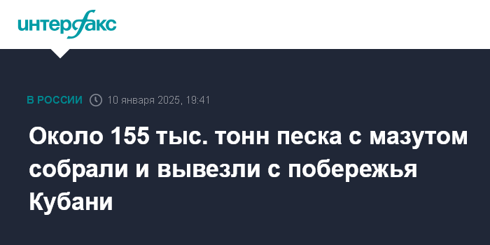Москва. 10 января. INTERFAX.RU - Спасатели и волонтеры собрали с побережья города-курорта Анапы и Темрюкского района Краснодарского края порядка 155 тыс. тонн песка с мазутом, сообщил губернатор региона Вениамин Кондратьев в своем телеграм-канале.