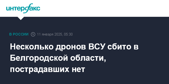 Москва. 11 января. INTERFAX.RU - Несколько украинских беспилотников самолетного типа сбито над Белгородским районом, сообщил губернатор Белгородской области Вячеслав Гладков.