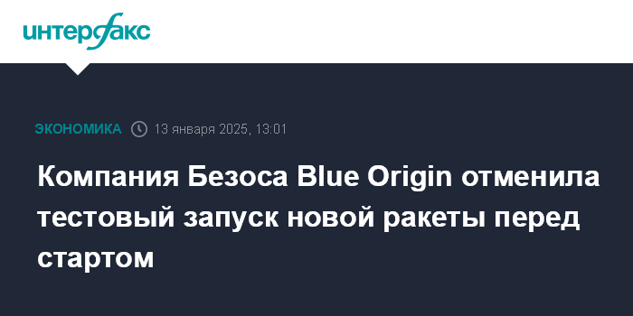 Москва. 13 января. INTERFAX.RU - Первый тестовый запуск тяжелой ракеты New Glenn, планировавшийся 13 января, отменен по техническим причинам, сообщила компания-разработчик ракеты Blue Origin. Компания создана основателем Amazon Джеффом Безосом.