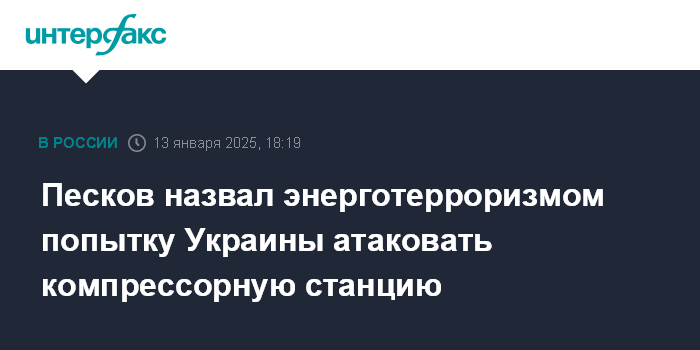 Москва. 13 января. INTERFAX.RU - Украинская попытка атаковать компрессорную станцию "Русская" в Краснодарском крае, обеспечивающую подачу газа по трубопроводу "Турецкий поток", является продолжением линии энергетического терроризма, заявил журналистам пресс-секретарь президента РФ Дмитрий Песков.