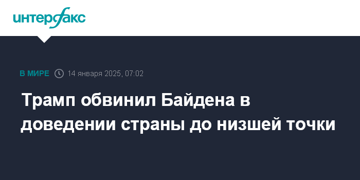 Москва. 14 января. INTERFAX.RU - Избранный президент США Дональд Трамп заявил, что за время президентства уходящего с поста Джо Байдена страна опустилась до низшего уровня в своей истории.