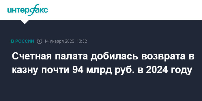 Счетная палата добилась возврата в казну почти 94 млрд руб. в 2024 году