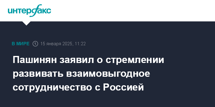 Москва. 15 января. INTERFAX.RU - Армения стремится развивать отношения с Россией на основе взаимовыгодного сотрудничества и суверенитета, написал в соцсети премьер-министр республики Никол Пашинян.