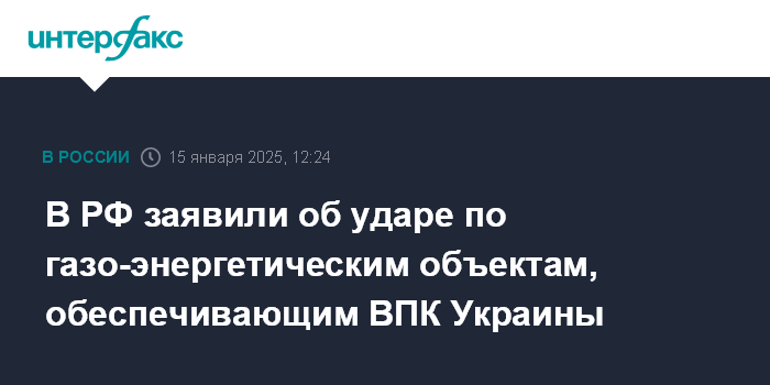 Москва. 15 января. INTERFAX.RU - Российские военные утром нанесли удар по критически важным объектам газо-энергетической инфраструктуры, обеспечивающим военно-промышленный комплекс (ВПК) Украины, заявили в Минобороны РФ в среду.