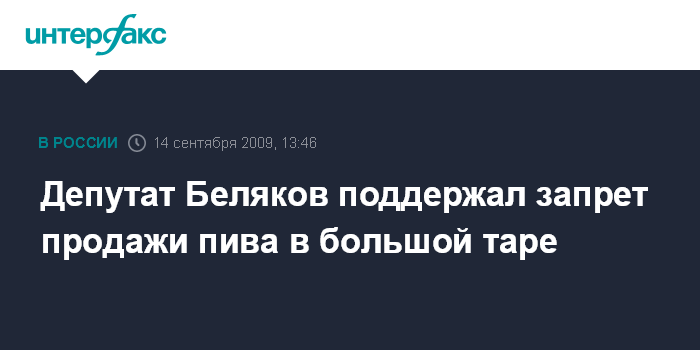 Москва. 14 сентября. INTERFAX.RU - Автор ряда антиалкогольных законодательных инициатив, депутат Госдумы Антон Беляков поддерживает запрет продажи пива в большой таре и считает эту меру весьма эффективной. "Ограничение на объем упаковки ново лишь для нашей страны. США и многие страны Европы давно уже живут именно по таким стандартам", - отметил Беляков.